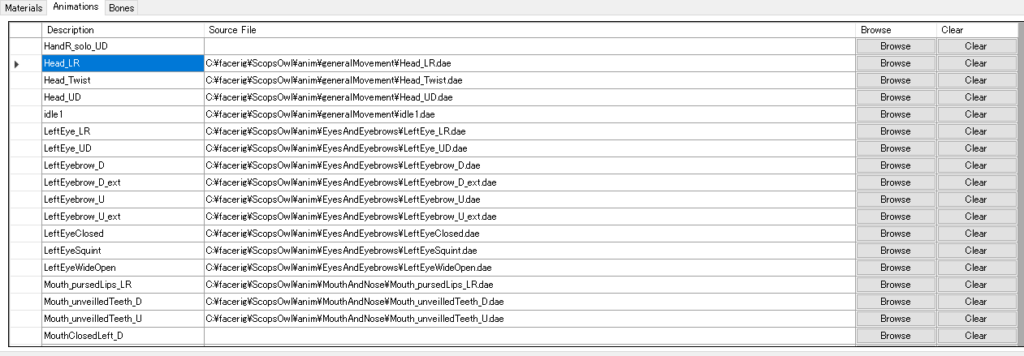 Open the Animation tab. Open “EyeAndEyebrows”, “generalMovement” and “MouthAndNose” in the anim folder of the downloaded folder. Compare the .dae folder and the animation tab in that folder and find the place that is blank with the same name. Press the Browse button in that blank space and select the .dae of the same name.